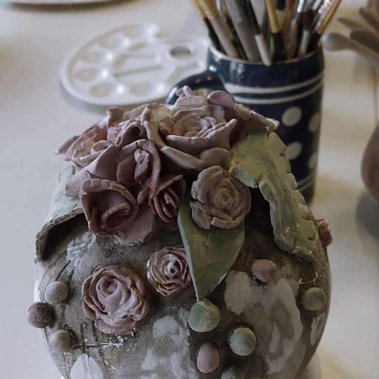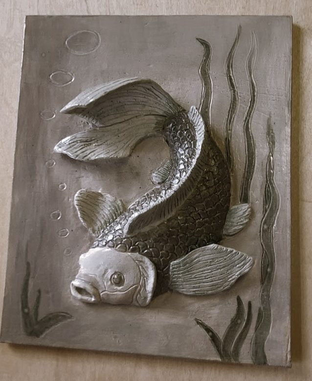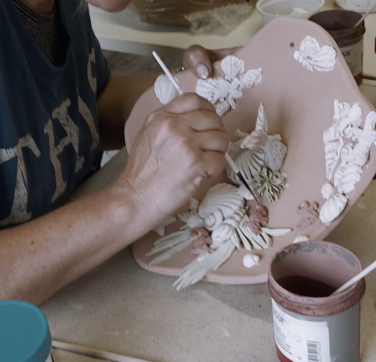 Nachdem das Stück gebrannt wurde, biete ich an, es mit einer transparenten Glasur zu überziehen und es wird ein zweites Mal gebrannt. Danach kann das Kunstwerk abgeholt werden.